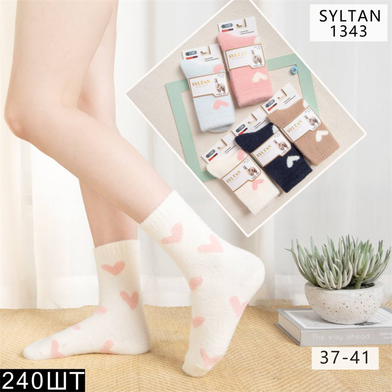 Женские носки зимние термо с рисунком сердечек высокие гладкие ассорти SYLTAN оптом мешками Арт 1343